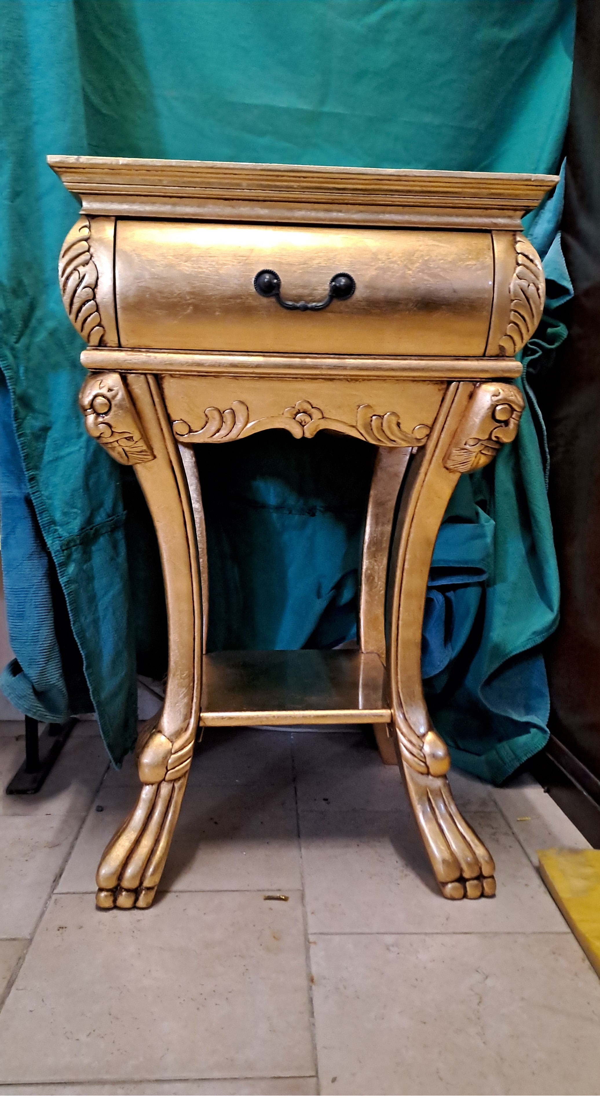 Costruito in legno e pasta di legno, è stato arricchito con dettagli intagliati