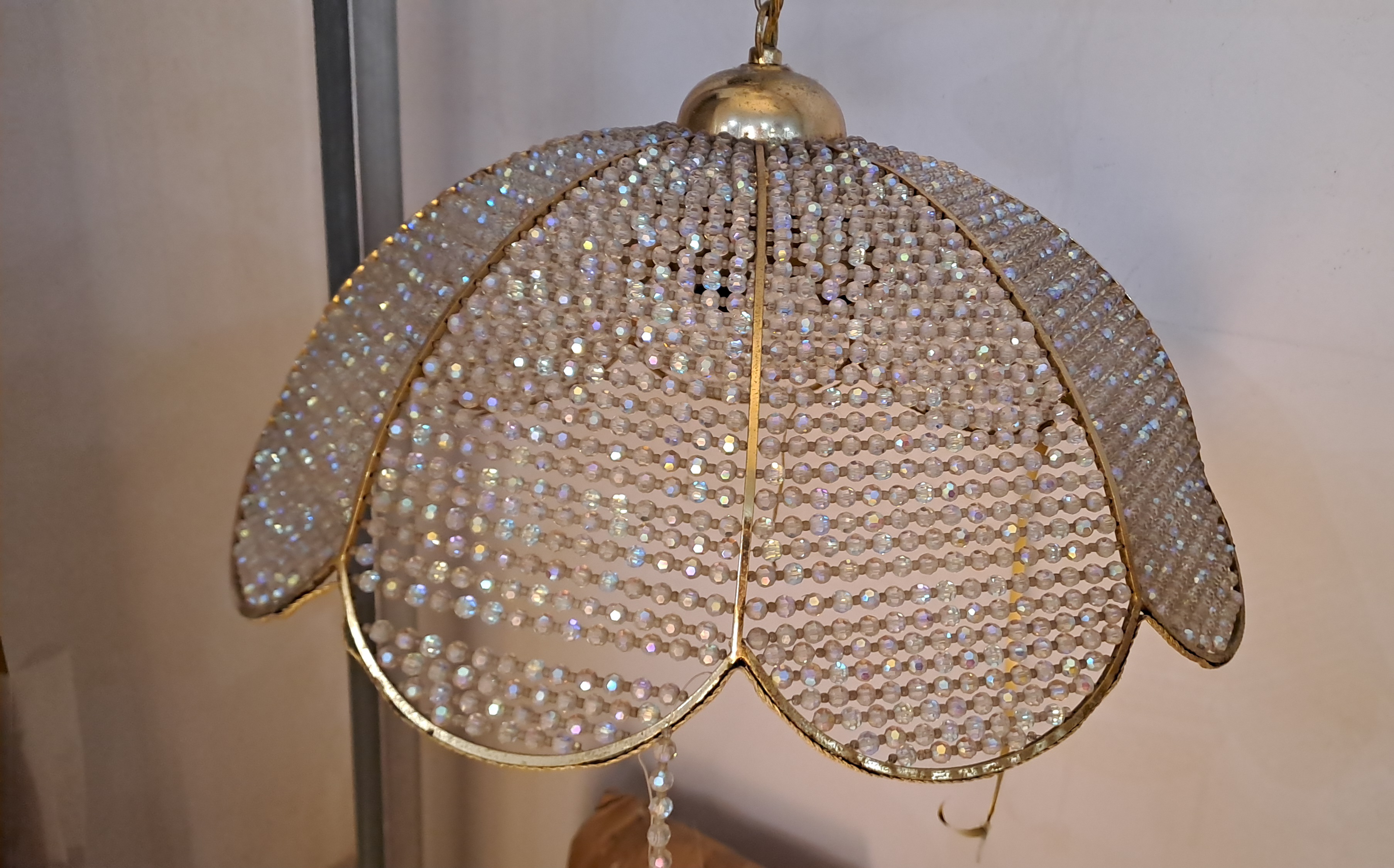 La parte esterna è in ottone, mentre la parte centrale è costituita di fili che sostengono i singoli cristalli di Swarosvki.Risulta in alcuni tratti danneggiato dallo scorrere del tempo (vedi foto), nonostante ciò con delle piccole riparazioni può nella sua semplicità dare ancora un tocco di eleganza e raffinatezza.
